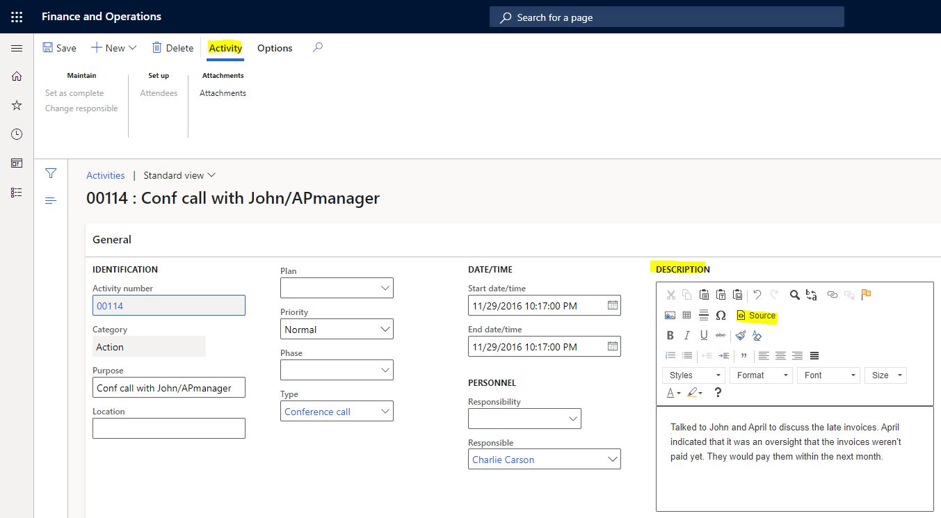 Standart bir form ve tablo üzerinden nasıl oluşturulduğuna bakalım. SmmActivities formunda Identification sekmesinden HTML Editor örneği mevcut. Buradan istediğiniz gibi bir metin oluşturabilirsiniz. Source butonu ile oluşan Html kodunu görebilirsiniz. Nasıl oluşturulduğuna bakalım.